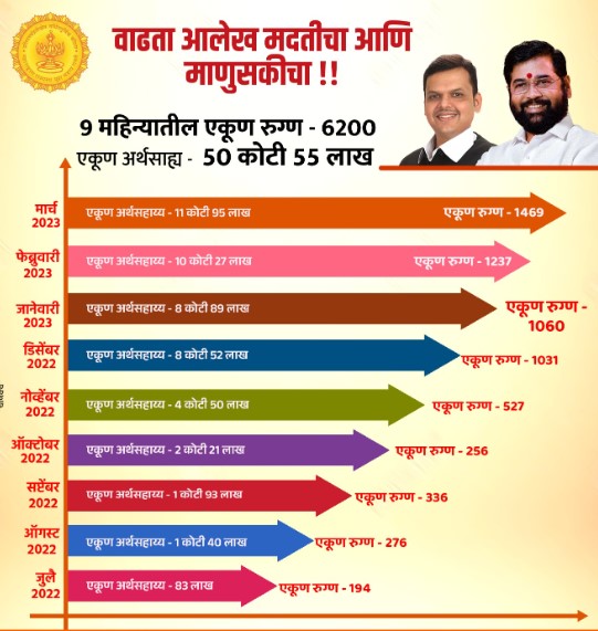 या कक्षामार्फत पहिल्याच म्हणजे जुलै २०२२ या महिन्यात 194 रुग्णांना 83 लाखांची मदत देण्यात आली. नंतर ऑगस्ट महिन्यात 276 रुग्णांना 1 कोटी 40 लाख, सप्टेंबर महिन्यात 336 रुग्णांना 1 कोटी 93 लाख, ऑक्टोबर महिन्यात 256 रुग्णांना 2 कोटी 21 लाख, नोव्हेंबर महिन्यात 527 रुग्णांना 4 कोटी 50 लाख, डिसेंबर महिन्यात 8 कोटी 52 लाख, जानेवारी 2023 मध्ये 8 कोटी 89 लाख तर फेब्रुवारी 2023 मध्ये 10 कोटी 27 लाख आणि मार्च 2023 मध्ये विक्रमी 11 कोटी 95 लाख रुपयांची वैद्यकीय मदत देण्यात आली आहे.